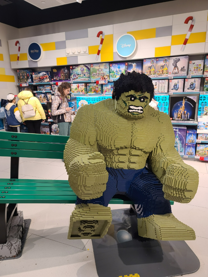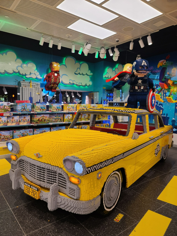 레고 스토어에 들어서니 레고 블록으로 만든 벤치에 앉아있는 헐크도 있고 노랑택시도 있었습니다. 사람들이 줄을 서서 헐크 옆에서 사진을 찍기도 하고 노랑 택시에 타서 사진을 찍기도 했습니다.