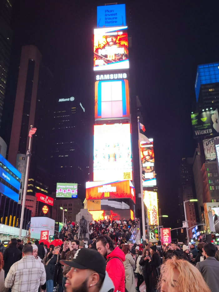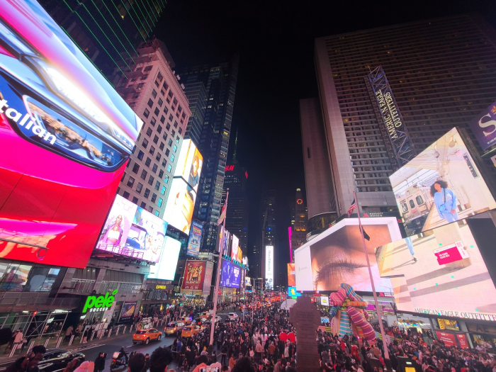 닌텐도 스토어에서 타임스퀘어까지는 조금 거리가 있었습니다. 주변 건물을 구경하고 분위기를 즐기다 보면 어느새 타임스퀘어에 도착했습니다. 타임스퀘어에는 정말 많은 사람들이 있었습니다. 타임스퀘어 광자에도 사람들이 많았고 붉은 계단 위에도 사람들이 많이 있었습니다.