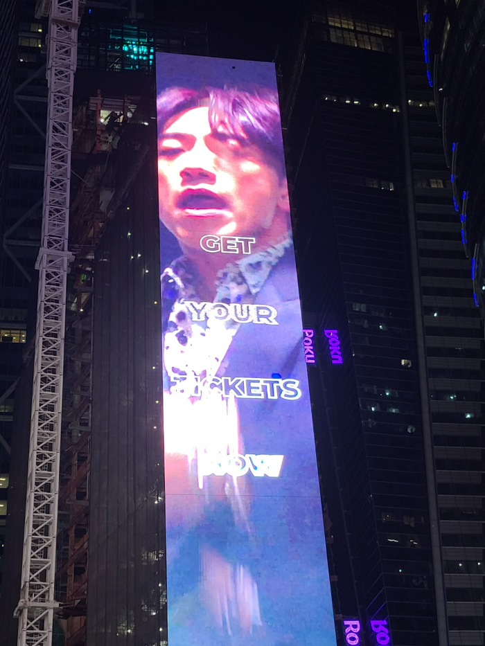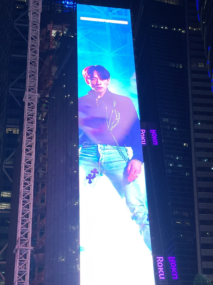 저희 가족도 붉은 계단 위쪽으로 올라갔습니다. 계단 위에서 광장을 내려다보니 광장 왼편에 저희가 타임스퀘어에 오기 며칠 전 정국이 게릴라 콘서트를 했다는 건물이 있었습니다. 타임스퀘어 광장 사방으로 건물들이 있었고 그 건물벽을 대형 전광판이 채우고 있었습니다. 그 전광판들에서 BTS, 재니를 볼 수 있어서 매우 뿌듯했습니다.