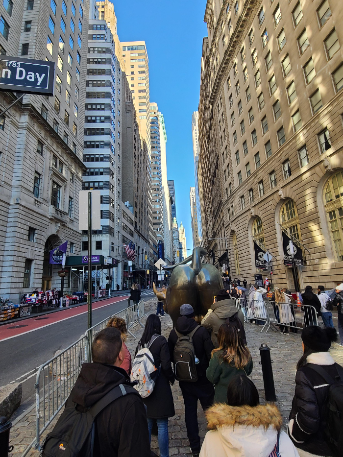 겁 없는 소녀상에서 사진을 찍고 다음 목적지인 돌진하는 황소에게로 향했습니다. 겁 없는 소녀상에서 걸어서 갈 수 있는 거리입니다. 돌진하는 황소상에도 관광객들의 줄이 길게 있었습니다. 아침 일찍이어서 그나마 줄이 적다고 다른 관광객이 말해주었습니다.