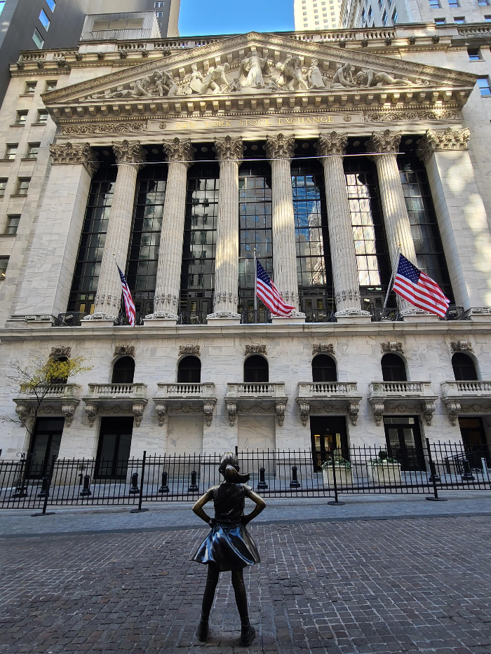뉴욕 증권거래소 앞에는 아주 당당한 소녀가 서 있습니다. 바로 '겁 없는 소녀' 상입니다. 양 허리에 손을 짚고 증권거래소를 바라보며 서 있는 모습이 매우 당당해 보입니다. 이 소녀상 앞에도 관광객들이 사진을 찍으려고 줄을 서서 기다립니다.