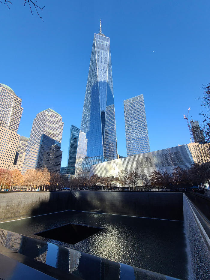 911 메모리얼 파크에 도착하자 물 흐르는 소리가 주위를 가득 채웠습니다. 다시는 이런 비극적인 사건이 발생하지 않기를 바라면서 다음 목적지인 뉴욕 증권거래소로 향했습니다.