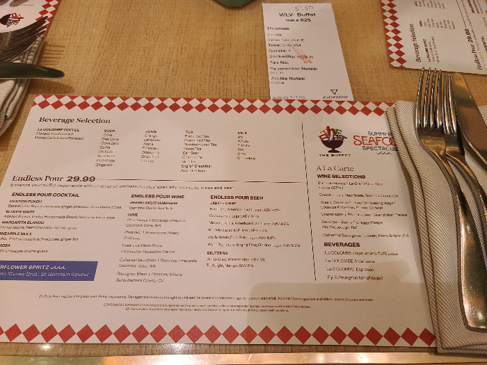 저희가 뷔페 이용에 대한 안내를 간략히 들은 후 저희 테이블을 담당하시는 직원분이 오시더니 음료수 종류가 적혀있는 메뉴판을 가져다주셨습니다. 메뉴판에는 칵테일 등이 포함된 유료로 이용할 수 있는 음료수와 무료로 제공되는 음료수가 있었습니다. 과일주스류와 탄산음료 그리고 커피 등은 무료로 즐길 수 있습니다. 저희를 담당해 주시는 직원분께 주스를 부탁드렸더니 주스를 금방 가져다주셨습니다.