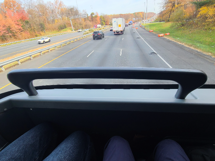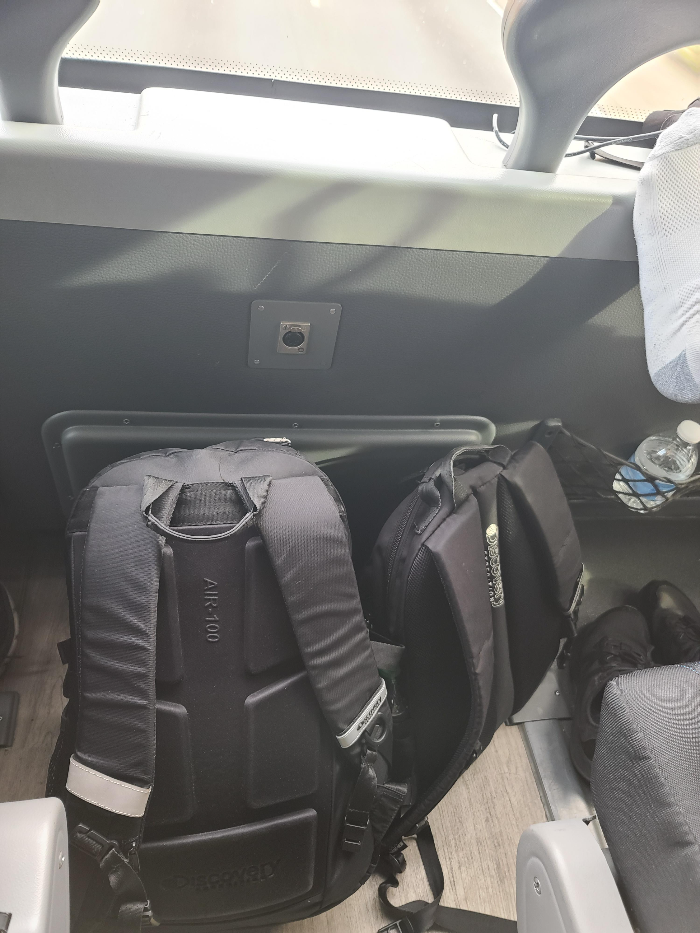 메가버스 2층 제일 앞자리는 추가 요금 40불을 지불할만한 충분한 가치가 있습니다. 우선 시야가 탁 트여있습니다. 그리고 앞에 작지만 짐을 둘 수 있는 여유 공간이 있습니다. 또한, 버스를 타고 가는 동안 발을 편하게(?)하고 갈 수도 있습니다.
