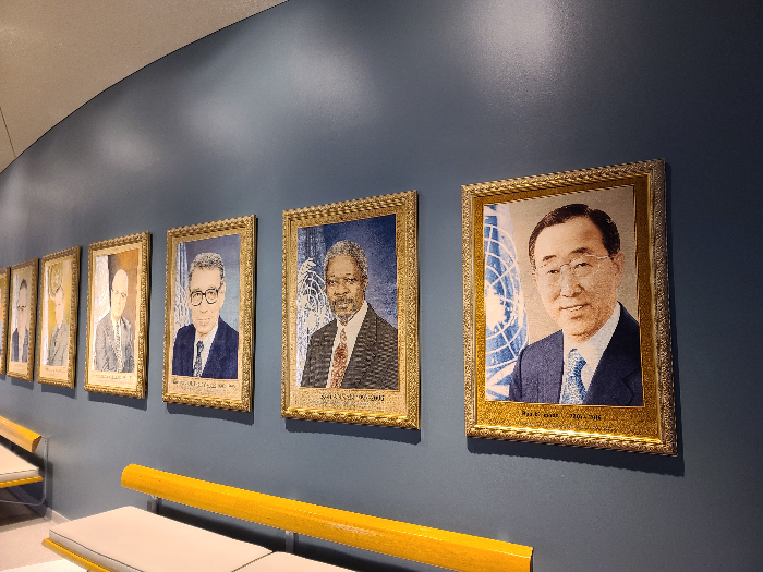 비지터 센터에서 나눠준 스티커를 가슴에 부착하고 검색대를 통과해서 유엔 본부 건물 안으로 들어갔습니다. 건물 내부에 역대 유엔 사무총장 초상화가 걸려있었는데 반기문 전 사무총장 초상화도 이었습니다.