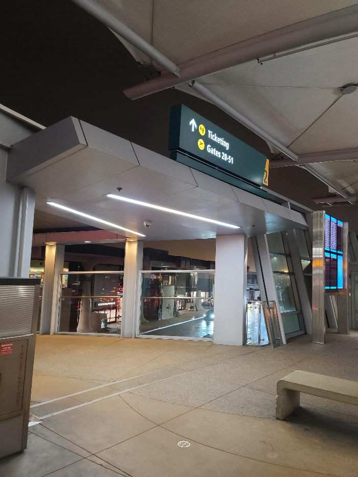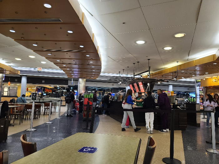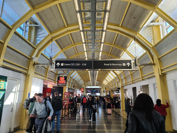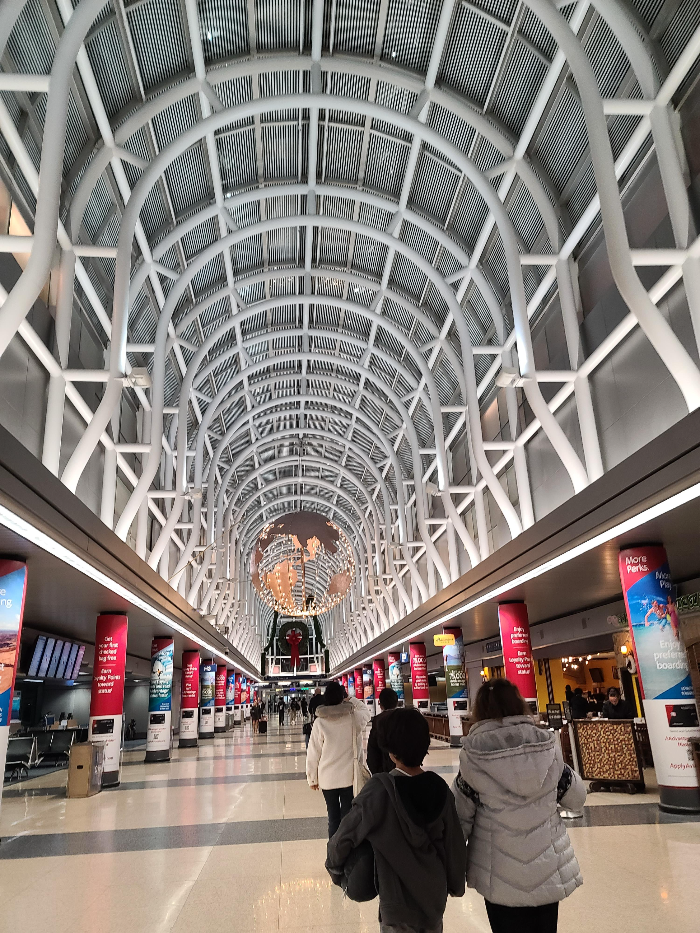 비행기를 타고 불이 꺼지자 저는 금방 잠이 들었습니다. 알고 보니 음료수도 줬다고 하는데 저는 그것도 모르고 잠마 잤습니다. 몇 시간이 지난 뒤 중간 경유지인 시카고 오해어공항에 새벽 5시에 도착했습니다. (시차가 3시간 있습니다.) 중간 경유 시간이 1시간 30분이었는데 위탁 수화물이 없어서인지 시간 여유가 있었습니다.